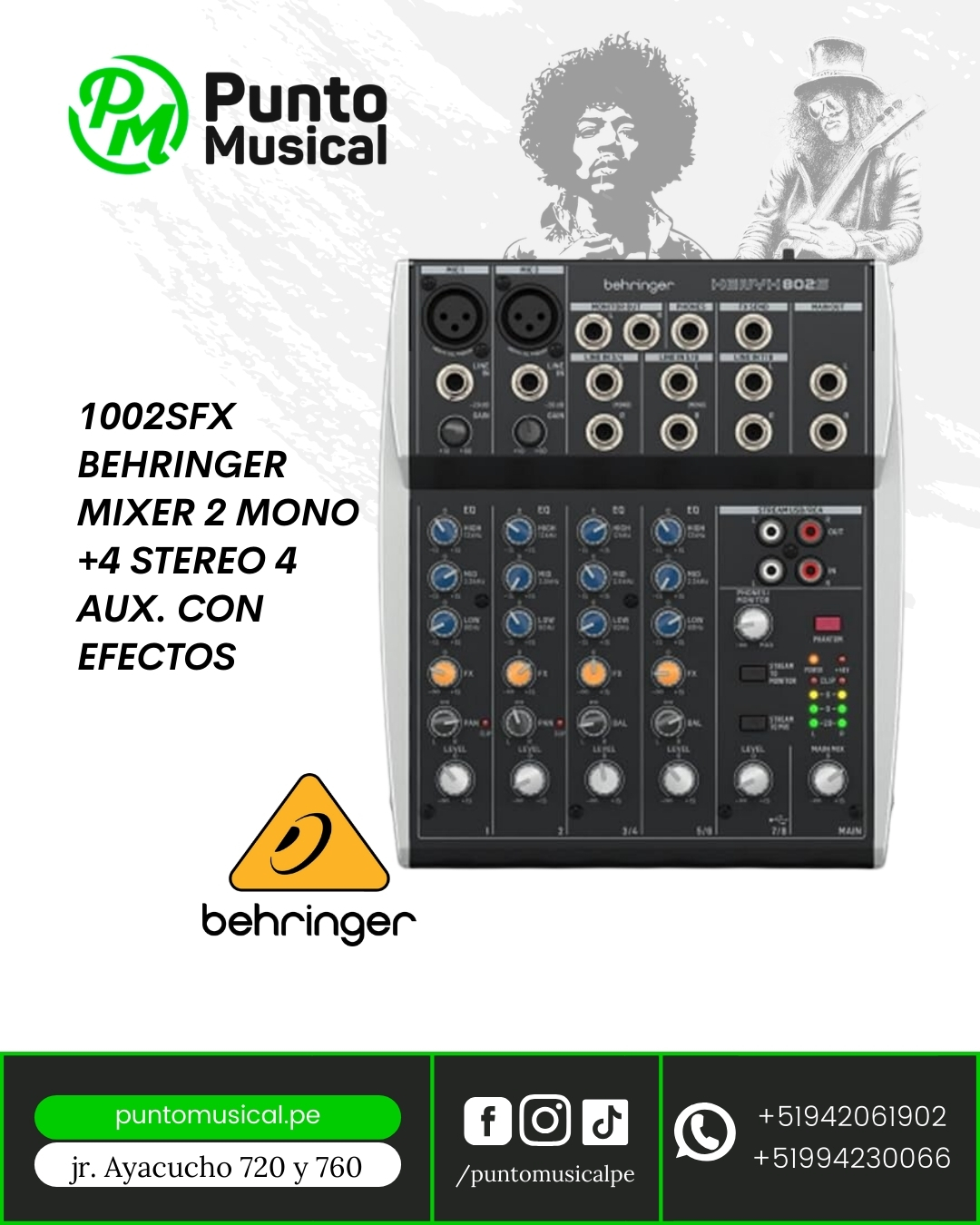La Behringer 1002SFX es una mesa de mezclas compacta y versátil que ofrece 2 canales mono con preamplificadores de micrófono XENYX de alta calidad, 4 canales estéreo y un total de 4 envíos auxiliares (AUX). Al igual que la 1002FX, este modelo incorpora un procesador de efectos integrado con una variedad de reverbs, delays, chorus y otros efectos digitales para enriquecer tus mezclas. Cada canal cuenta con ecualización de 3 bandas para moldear el sonido. Los 4 envíos AUX permiten una gestión flexible de las señales hacia monitores o procesadores de efectos externos (complementando los internos). La Behringer 1002SFX también dispone de salidas principales, salidas de control room y una salida para auriculares, brindando diversas opciones de monitorización. Su tamaño compacto y la inclusión de efectos la hacen ideal para pequeñas actuaciones en vivo, grabación en casa, podcasts y cualquier situación donde se requiera una mezcla de audio con efectos incorporados.