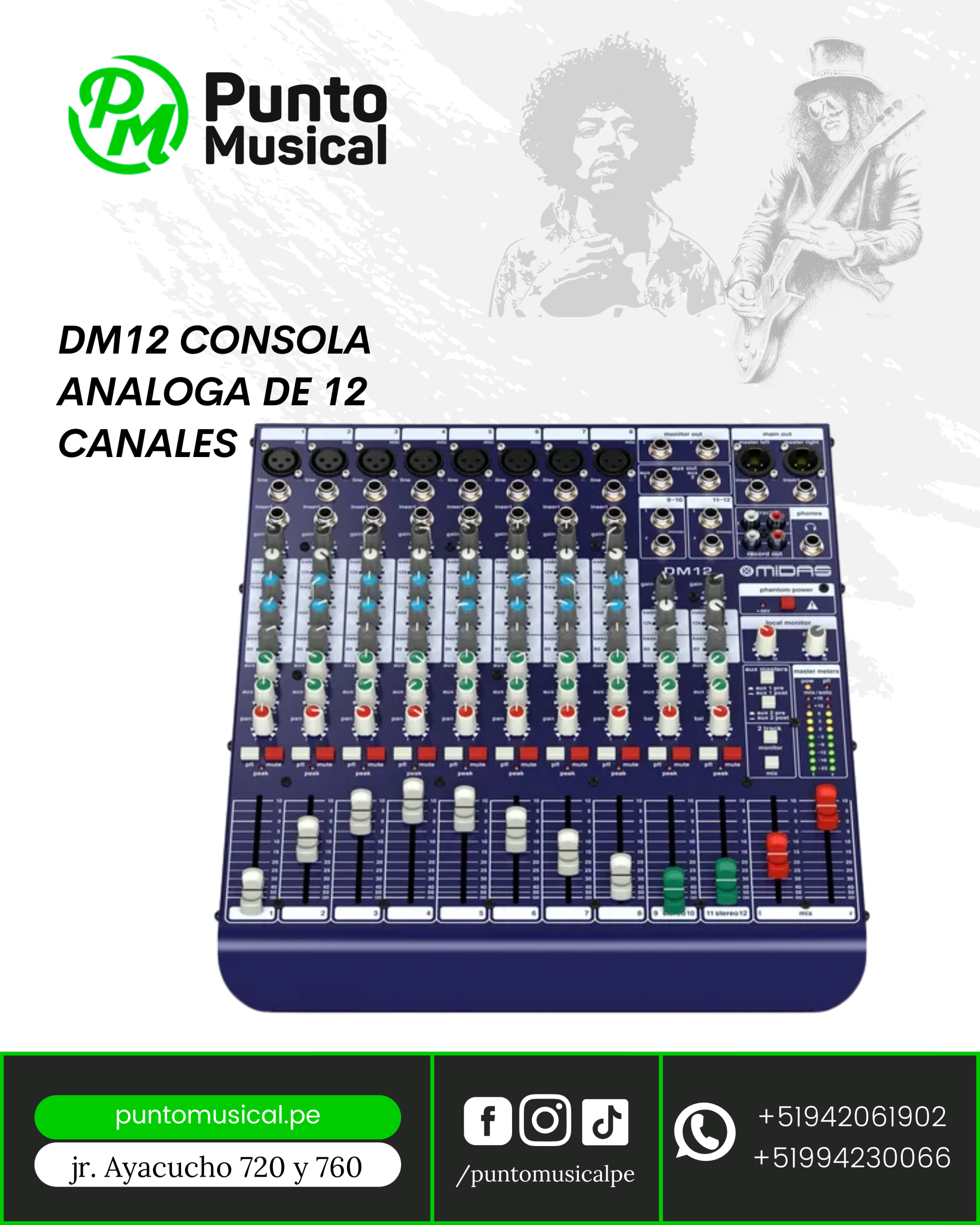La Consola Análoga DM12 de 12 canales es la opción perfecta para músicos, técnicos de sonido y productores que buscan una mesa confiable, versátil y fácil de usar. Con 12 entradas, ecualización precisa y conectividad completa, permite mezclar audio en vivo o en estudio con gran calidad y control total. Su diseño robusto garantiza durabilidad, ideal para ensayos, presentaciones y home studio.